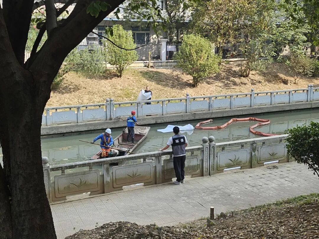 在受污染河段布设围油栏、投放吸油毡,有效拦截和吸附水面污染物;